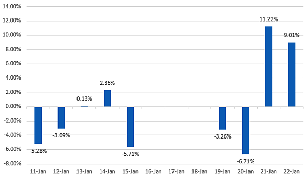 以下是近2周油價日報酬率的表現:
