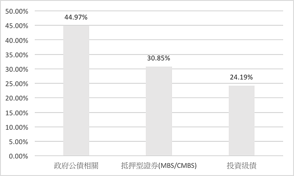 因此以美元保單為例子,可能投資的商品不外乎美國公債、不動產抵押證券(MBS/CMBS,其中房利美 房地美 吉利美皆為美國政府所保證)、與美元投資級債,依照下列指數的比重來看,整體的平均殖利率約為2.5%左右。