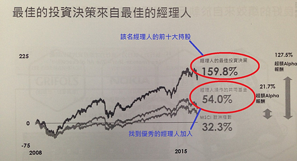 最後回到投資上,原則上他不是一檔什麼多空操作、或是什麼美元配9%的怪物,就台灣的共同基金投資市場,他只是一檔歐洲”股票”基金。但是如果我現在看好歐洲股市想要進場,我會把他納入我的口袋名單當中,因為他的投資哲學與策略是全世界獨一無二,一檔基金夠同時擁有多位歐洲頂尖投資人幫你操作,而且還只給你把握度最高的10檔,我是信奉凱因斯制度經濟學的人,因此我認為這樣的制度是可以獲得成功的方法。