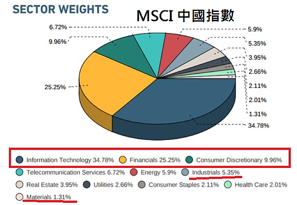 首先我們先看一下MSCI中國指數,前三大產業為1) 資訊科技34.78%、2) 金融 25.25%、3) 非必需消費 9.96%,因此一般大家買到的中國基金也多半是以這三大類股為主。