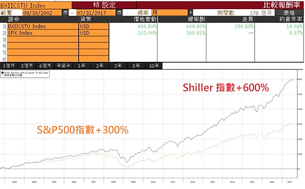 過去15年以來(最長的資料期間),Shiller美股指數上漲超過600%,同時期S&P500指數上漲300%,Shiller 大神屌虐市場的報酬率超過1倍!
