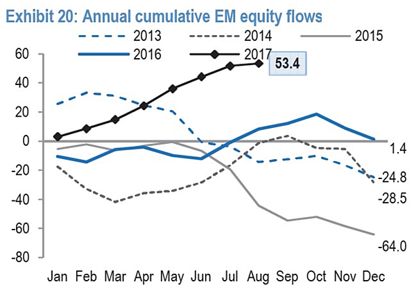 答:『截至2017年7月底,MSCI新興市場指數上漲逾25%,回顧近年2009、2010、2012等年度,在資金大幅流入的情況之下,新興市場股市表現均相當優異。』