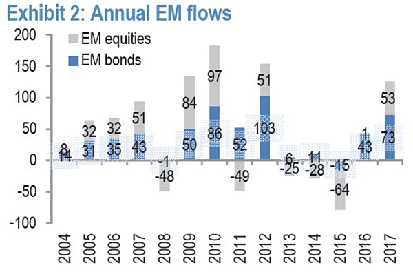 答:「從下圖來看,2016年持平做收,主要是11月川普當選後引發的震盪,但是2017年以來全球資金持續流入新興市場股票投資題材。」