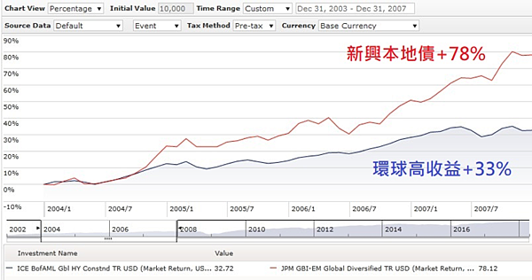 到了2008年,新興本地債還是相對抗跌,因此從2004年到2008年底,既便經歷了金融海嘯,新興本地債還有+68%的報酬率。反觀而過去幾年上漲不多的高收益債,2008年還大跌了27%,2004-2008年高收益債累積報酬率-3.75%,你說那個年代要是理專推薦高收益債,會不會被客戶罵到臭頭。