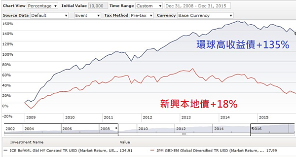 而截至2014年以摩根新興本地債指數為指標的管理資金已成長至2200億美金,高收益債指數則在3000億美金左右,兩者籌碼一樣亂,若金融風暴一來應該五十步與百步的差別@@