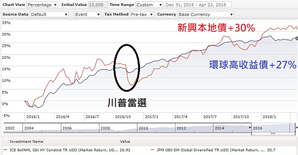 因此自2015年升息確立後,本地債上漲的速度的確是超越了高收益債,只是在2016年底川普當選造成本地債有一個明顯的回落,但隨即又快速的上漲。
