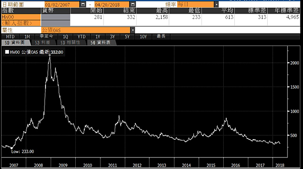 同時高收益債目前的利差是330點,已經是金融海嘯以來最低水準,雖然距離2007年的233點,還有將近100點的收斂空間,但這也顯示上方的漲幅相對限縮。