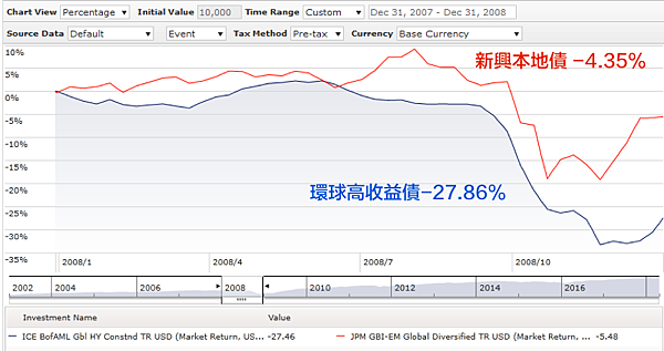 看到這裡大家都矇了,大家都以為(只是心裡以為)新興本地債波動好像很大,在2008年一定血流成河,但是以年度報酬計算,高收益債的跌幅25%~35%不等,遠大於新興本地債下跌不到5%,為什麼?小黑拆解給大家看。