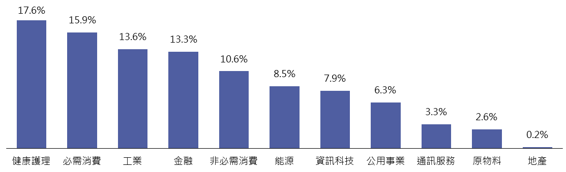 首先,從產業分布來看,MSCI世界高股息指數的第一大產業是健康護理、第二大是必需消費,這兩個產業在台灣都是權重相對較低的產業,而科技產業僅有8%,因此可以分散投資人在科技股持有比重過高的風險。
