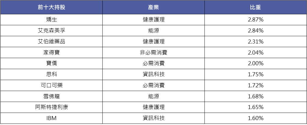 再從前十大持股觀察,可以看到如嬌生,或是股神巴菲特最愛的可口可樂等大型龍頭企業。這些公司在台灣股市都相對少見,市值規模也遠高於台灣上市公司。