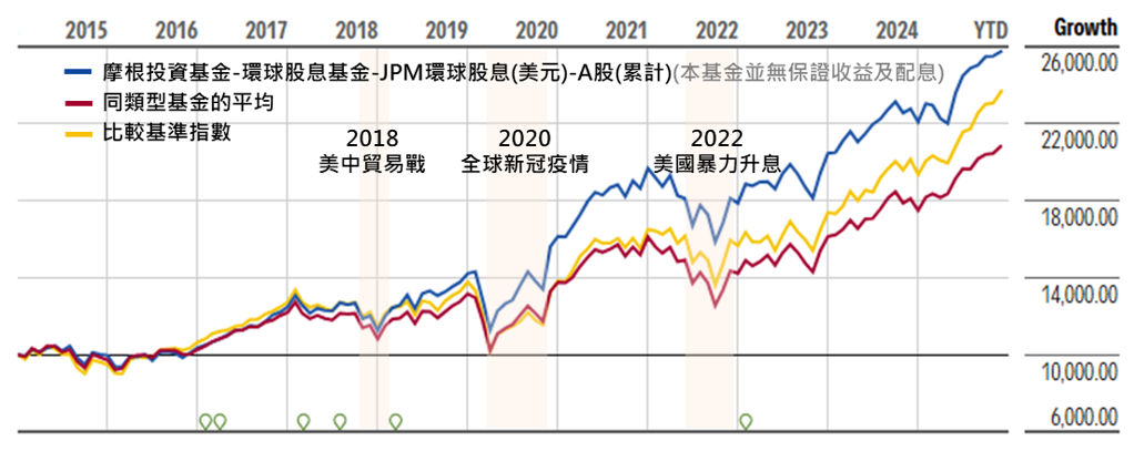 經得起風浪:富達基金-全球入息基金(本基金之配息來源可能為本金且並無保證收益及配息)成立於2012年,摩根投資基金-環球股息基金(本基金之配息來源可能為本金且並無保證收益及配息)則成立於2006年兩者皆經歷了多次的重大風險事件,例如:2018年中美貿易戰、2020年全球新冠疫情,以及2022年美國暴力升息等,顯示其策略相對經得起市場考驗。