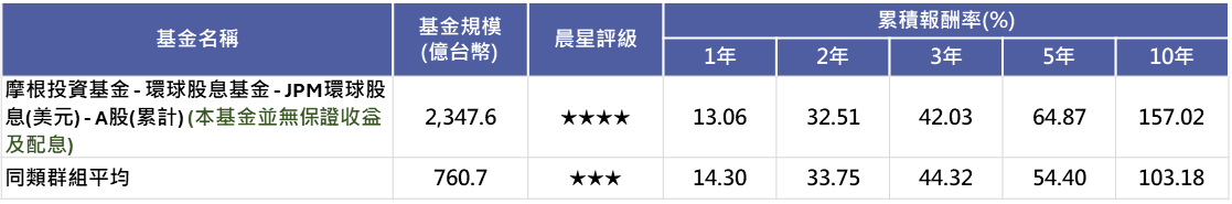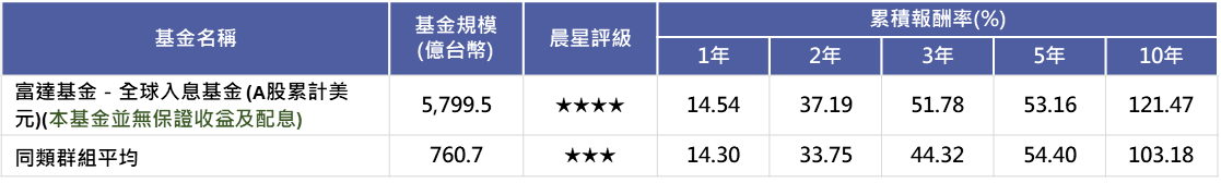 具規模優勢:在基金規模方面,富達基金-全球入息基金(本基金之配息來源可能為本金且並無保證收益及配息)規模達5,799.5億台幣,摩根投資基金-環球股息基金(本基金之配息來源可能為本金且並無保證收益及配息)規模為2,347.6億台幣,皆遠高於同類型群組平均的760.7億台幣,流動性與穩定性可見一斑。