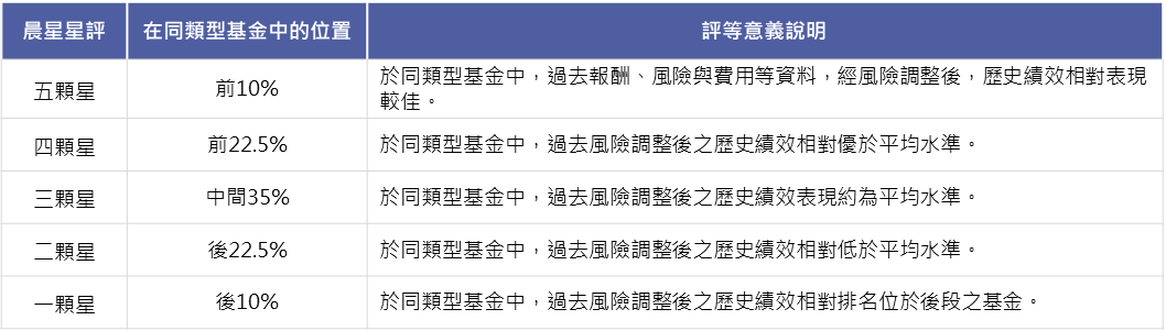 權威評級認證:晨星(Morningstar)是一家全球知名的獨立投資研究機構,其星級評級是根據基金的報酬、風險與費用等面向,經風險調整後與同組基金比較而得出的綜合指標。這二檔基金皆獲得晨星四顆星,代表其在同類型基金中屬於表現優於平均的水準,反映出基金管理與長期績效的穩健性。不過需要強調的是,星級評等僅為歷史表現的比較結果,並不能作為未來績效的保證。